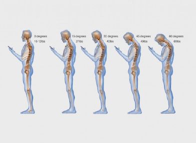 The computer is not the only technology to affect our neck posture! The phone has become our third appendage, and in the picture below you can get a sense of how stress builds on the neck as the degree of forwardness advances. That 5-11 pounds starts to create some compound interest of the negative kind on our mid and lower neck. These are the segments of the cervical spine where the majority of surgeries take place.
