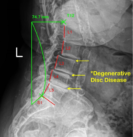 For some proof, let’s take a look at the X-ray with the numbering. Focus on the segment labeled L4-L5 and notice how little space remains between those vertebrae. That tight gap signals advanced degeneration and a spine under constant stress. It is a severe degenerative condition, and there is not much “gold” there! Look one level higher in the degenerative spine and you’ll see additional disc loss. At L2, the vertebra has shifted forward on L3, adding another layer of strain the body must manage.