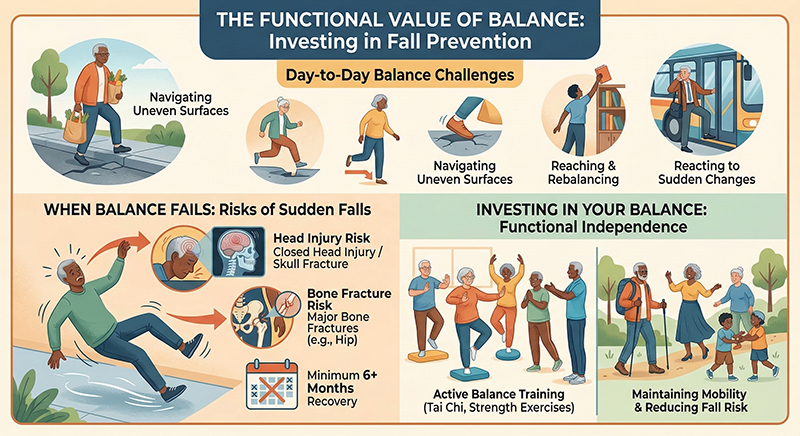 Due to the potential for so much damage and lifestyle disruption from a fall, there is not a more valuable area to invest one’s time than in balance training as a preventative action and for many it could be just a tune up process versus a major overhaul.